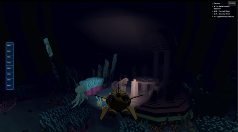 DEEP DIVE lets you explore a charming low-poly underwater world with a submarine drone. Simple keyboard controls allow movement, turning, and depth adjustment, with a toggleable flashlight enhancing visibility. Realistic terrain features and plants like corals and seaweeds add visual appeal. Animated creatures, including schooling fish, jellyfish, octopus, crab, and dynamic predators like sharks, bring the scene to life. Particle effects, thoughtful lighting and BGM create an immersive deep-sea atmosphere, making DEEP DIVE an exciting underwater exploration experience.